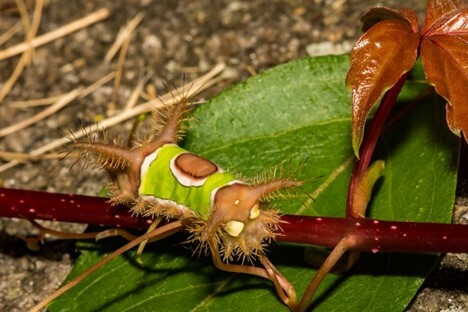 The striking Saddleback Caterpillar has a brownish-red body with a bright green stripe in the middle, topped by what looks like a tiny brown saddle. The creepy part is those urticating hairs protruding from the rest of the body. If you dared to touch one, those hairs would get into your skin, causing a swollen rash, and maybe even nausea. The Saddleback Caterpillar lives in Mexico, and in the eastern parts of North America. Watch out Floridians!