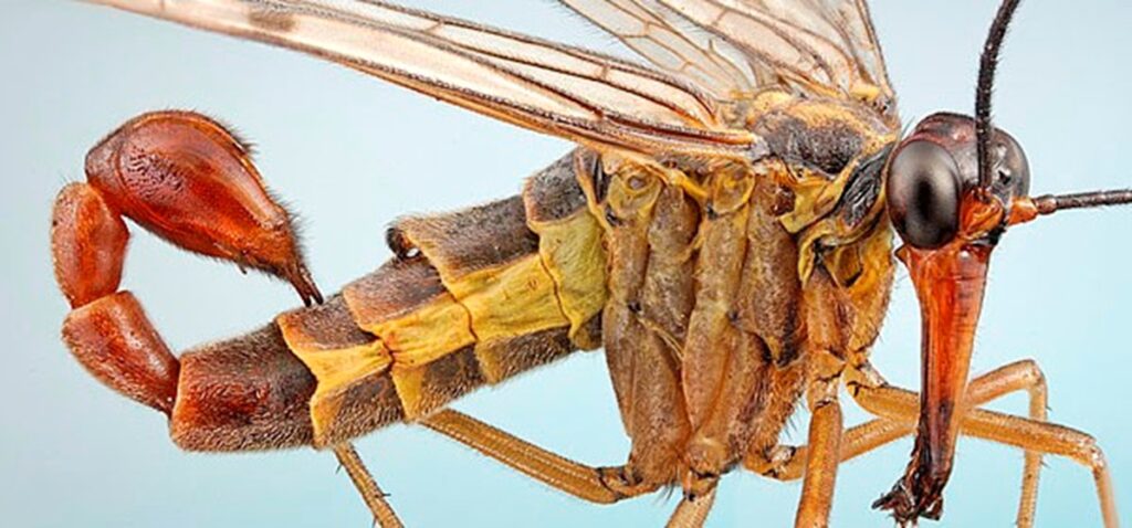 The scorpionfly, as its name suggests, has a curved ‘tail’ that looks like a sting. It is, in fact, the males’ claspers for mating. It is yellow and black, with a long ‘beak’ and truly does look like something out of your nightmares. Like the flesh fly, this little thing is used by scientists in human cadaver studies.